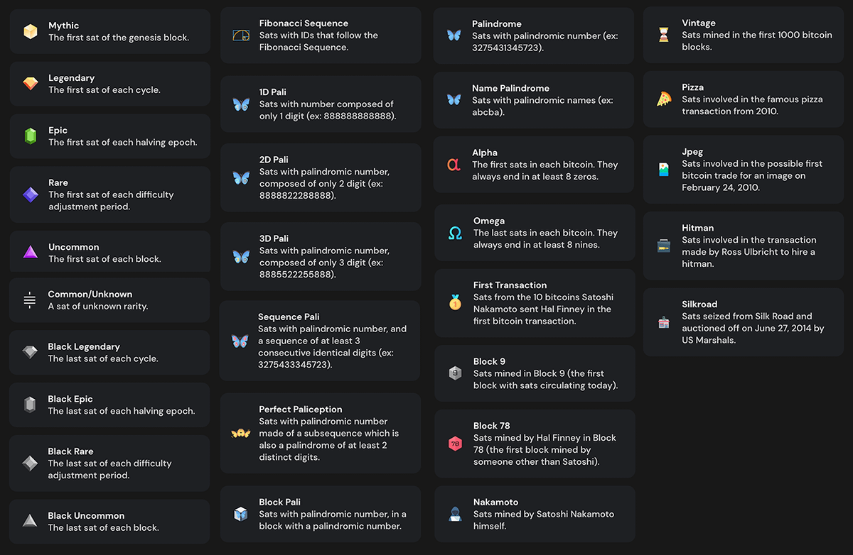 Named after Casey Rodarmor, the creator of the Ordinal Theory, the Rodarmor Rarity Index is used to determine a sat’s special attributes. The index breaks down rare satoshis into the following categories.